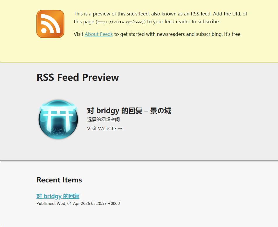 但是一位朋友提醒我,文章的评论RSS并不可用,只查询到文章本身的提要。我自己用RSS订阅器也发现了这一问题,居然只有一个页面本身的URL。