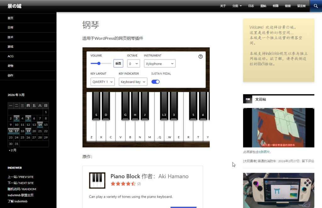日常 新插件:钢琴 日志 2026年3月20日 远景の域主 留下评论 最近在WordPress的区块插件库发现一个特别的插件——钢琴区块 Piano Block,这个小东西没有什么实用功能,只是休闲一乐。令人想起早些年的Windows侧边栏小工具(其实都是Web技术) 感觉很有意思,于是加到了网站上。可以点击下面的钢琴图像访问它。 Piano Block 当然还有WinAMP的插件,不过我没有使用过WinAMP,就不表了……以后再试。也许你也观察到了,我还放置了便笺区块……越来越像个人空间的说!